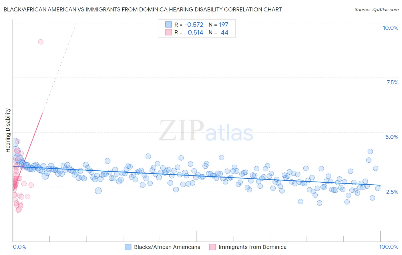 Black/African American vs Immigrants from Dominica Hearing Disability Correlation Chart
