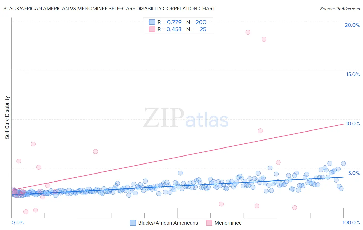 The statistical analysis conducted on geographies consisting of 564,146,018 people shows a strong positive correlation between the proportion of Blacks/African Americans and percentage of population with self-care disability in the United States with a correlation coefficient (R) of 0.779 and weighted average of 2.9%. Similarly, the statistical analysis conducted on geographies consisting of 45,776,619 people shows a moderate positive correlation between the proportion of Menominee and percentage of population with self-care disability in the United States with a correlation coefficient (R) of 0.458 and weighted average of 2.8%, a difference of 2.8%.