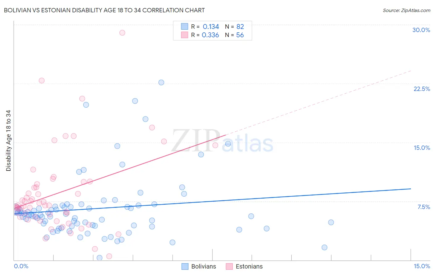Bolivian vs Estonian Disability Age 18 to 34 Correlation Chart