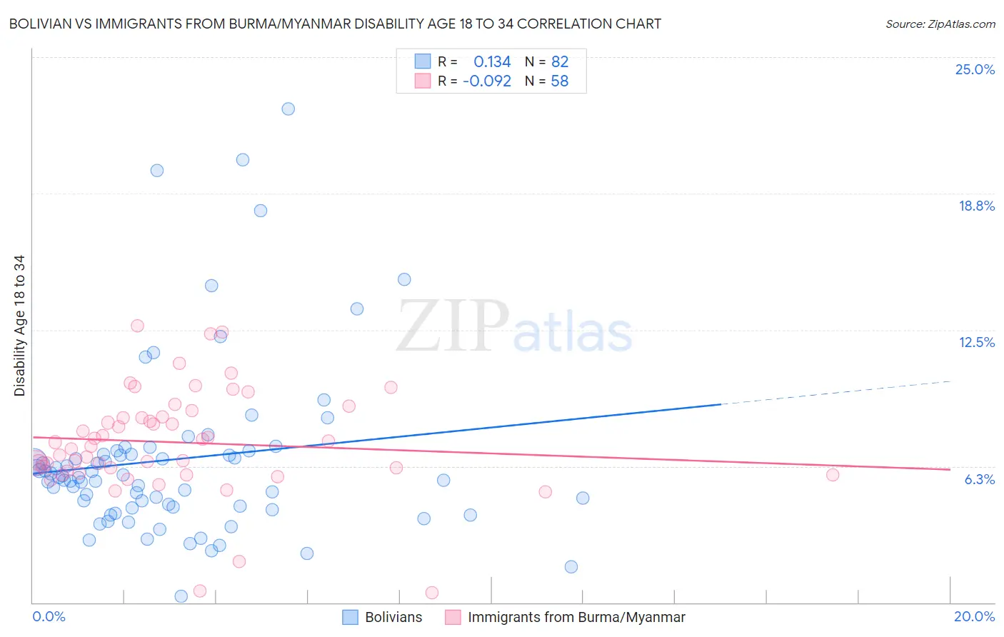 The statistical analysis conducted on geographies consisting of 184,550,296 people shows a poor positive correlation between the proportion of Bolivians and percentage of population with a disability between the ages 18 and 35 in the United States with a correlation coefficient (R) of 0.134 and weighted average of 5.8%. Similarly, the statistical analysis conducted on geographies consisting of 172,278,833 people shows a slight negative correlation between the proportion of Immigrants from Burma/Myanmar and percentage of population with a disability between the ages 18 and 35 in the United States with a correlation coefficient (R) of -0.092 and weighted average of 6.8%, a difference of 17.0%.