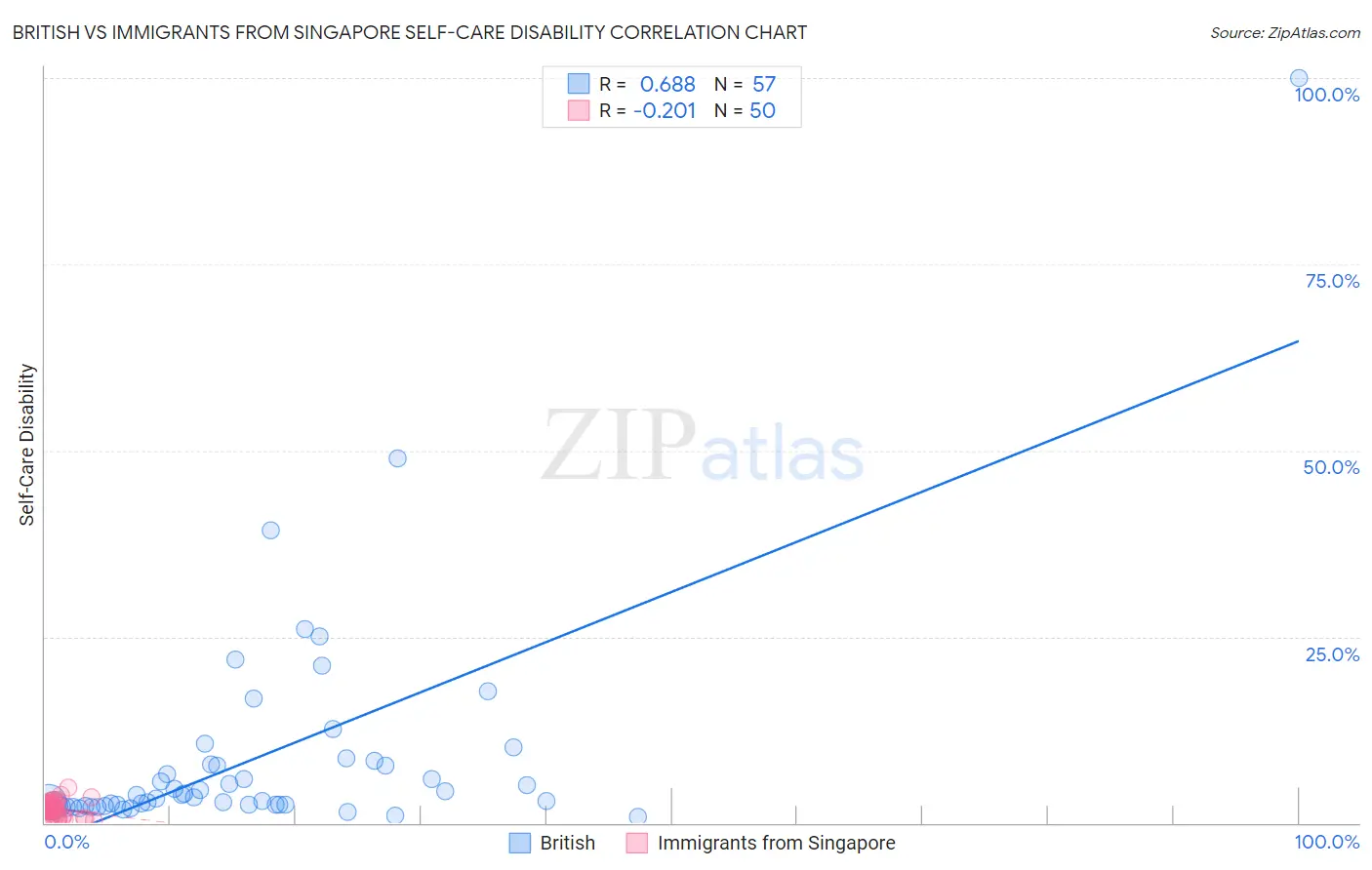 British vs Immigrants from Singapore Self-Care Disability Correlation Chart