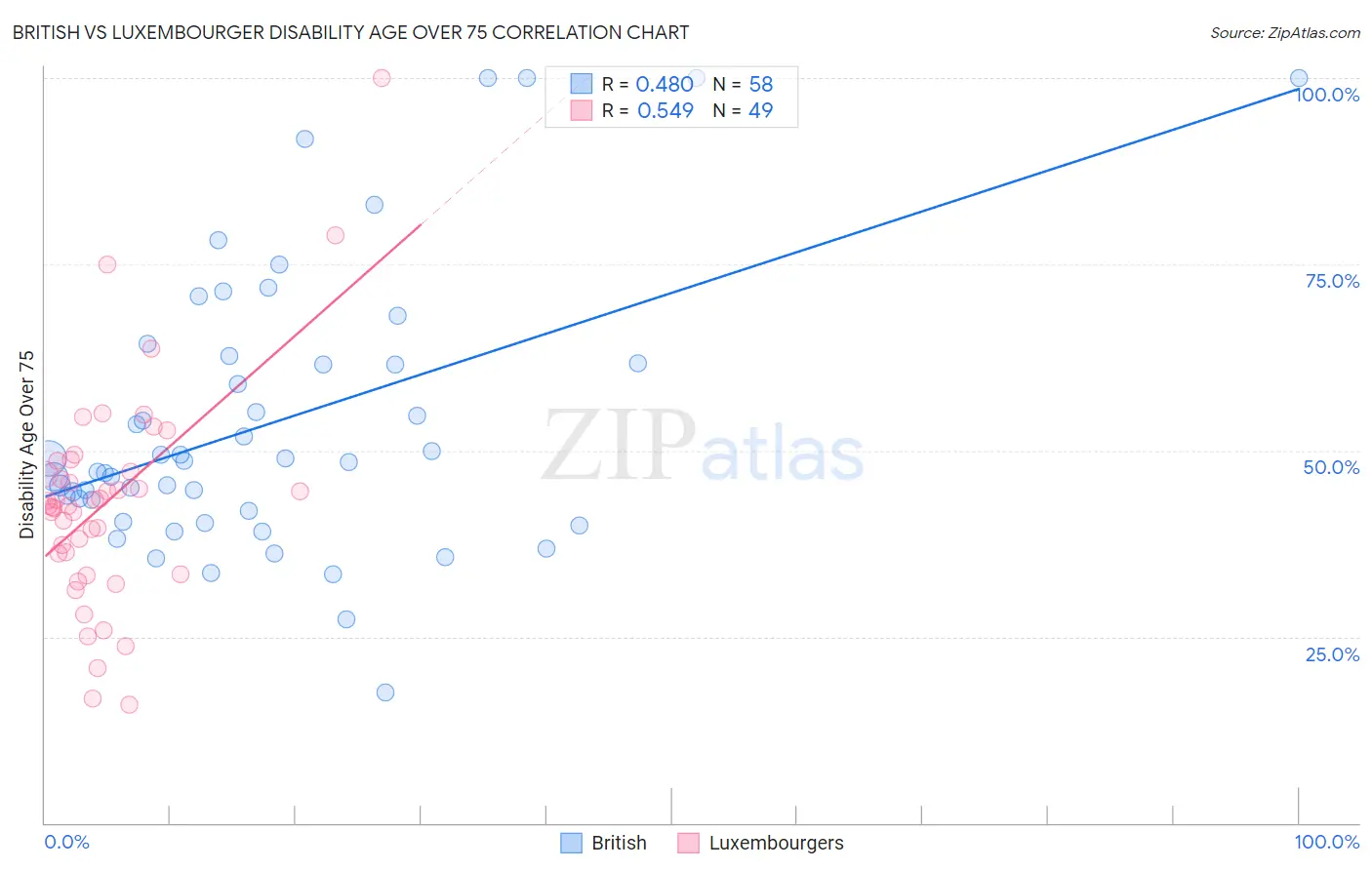 The statistical analysis conducted on geographies consisting of 529,995,631 people shows a moderate positive correlation between the proportion of British and percentage of population with a disability over the age of 75 in the United States with a correlation coefficient (R) of 0.480 and weighted average of 46.5%. Similarly, the statistical analysis conducted on geographies consisting of 144,572,010 people shows a substantial positive correlation between the proportion of Luxembourgers and percentage of population with a disability over the age of 75 in the United States with a correlation coefficient (R) of 0.549 and weighted average of 44.8%, a difference of 3.8%.