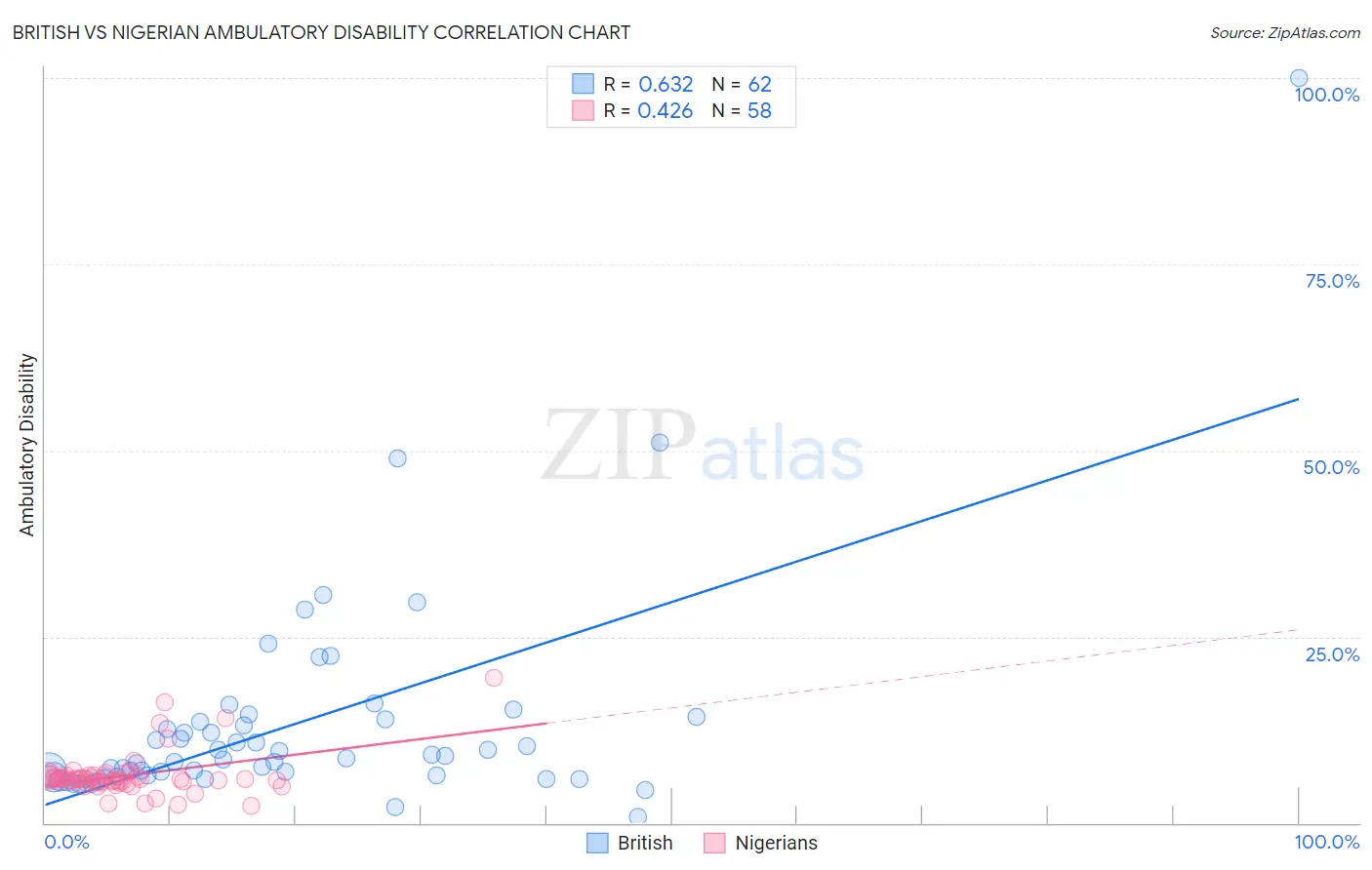 The statistical analysis conducted on geographies consisting of 531,154,282 people shows a significant positive correlation between the proportion of British and percentage of population with ambulatory disability in the United States with a correlation coefficient (R) of 0.632 and weighted average of 6.2%. Similarly, the statistical analysis conducted on geographies consisting of 332,639,431 people shows a moderate positive correlation between the proportion of Nigerians and percentage of population with ambulatory disability in the United States with a correlation coefficient (R) of 0.426 and weighted average of 6.1%, a difference of 1.8%.