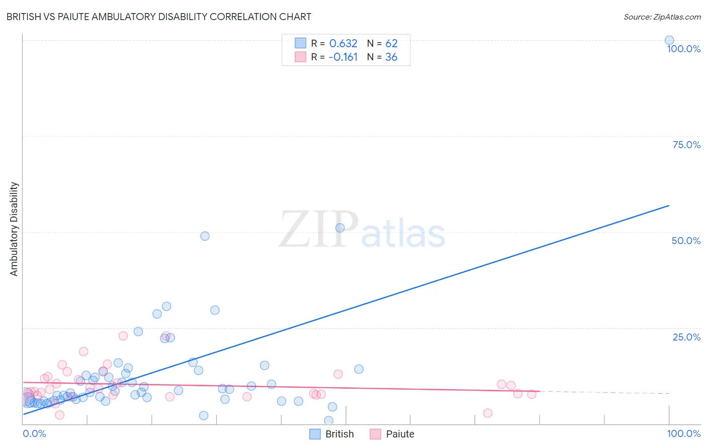 The statistical analysis conducted on geographies consisting of 531,154,282 people shows a significant positive correlation between the proportion of British and percentage of population with ambulatory disability in the United States with a correlation coefficient (R) of 0.632 and weighted average of 6.2%. Similarly, the statistical analysis conducted on geographies consisting of 58,391,383 people shows a poor negative correlation between the proportion of Paiute and percentage of population with ambulatory disability in the United States with a correlation coefficient (R) of -0.161 and weighted average of 7.7%, a difference of 24.6%.