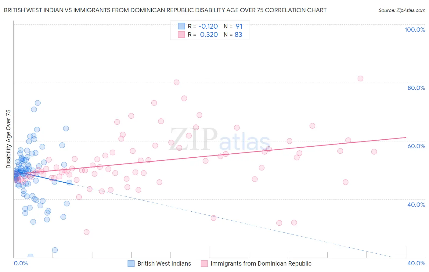 British West Indian vs Immigrants from Dominican Republic Disability Age Over 75 Correlation Chart