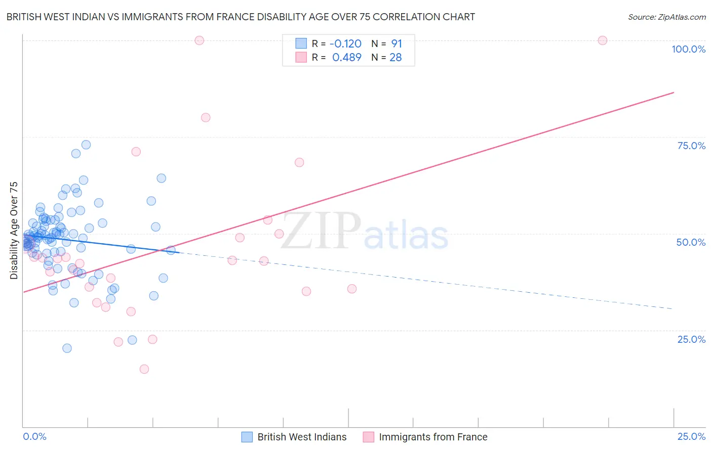 British West Indian vs Immigrants from France Disability Age Over 75 Correlation Chart