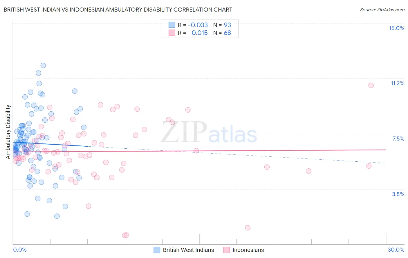 The statistical analysis conducted on geographies consisting of 152,684,150 people shows no correlation between the proportion of British West Indians and percentage of population with ambulatory disability in the United States with a correlation coefficient (R) of -0.033 and weighted average of 7.0%. Similarly, the statistical analysis conducted on geographies consisting of 162,682,177 people shows no correlation between the proportion of Indonesians and percentage of population with ambulatory disability in the United States with a correlation coefficient (R) of 0.015 and weighted average of 6.3%, a difference of 10.6%.