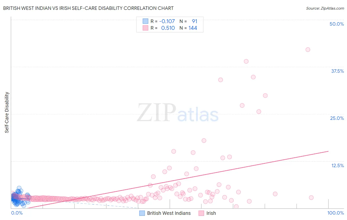 British West Indian vs Irish Self-Care Disability Correlation Chart