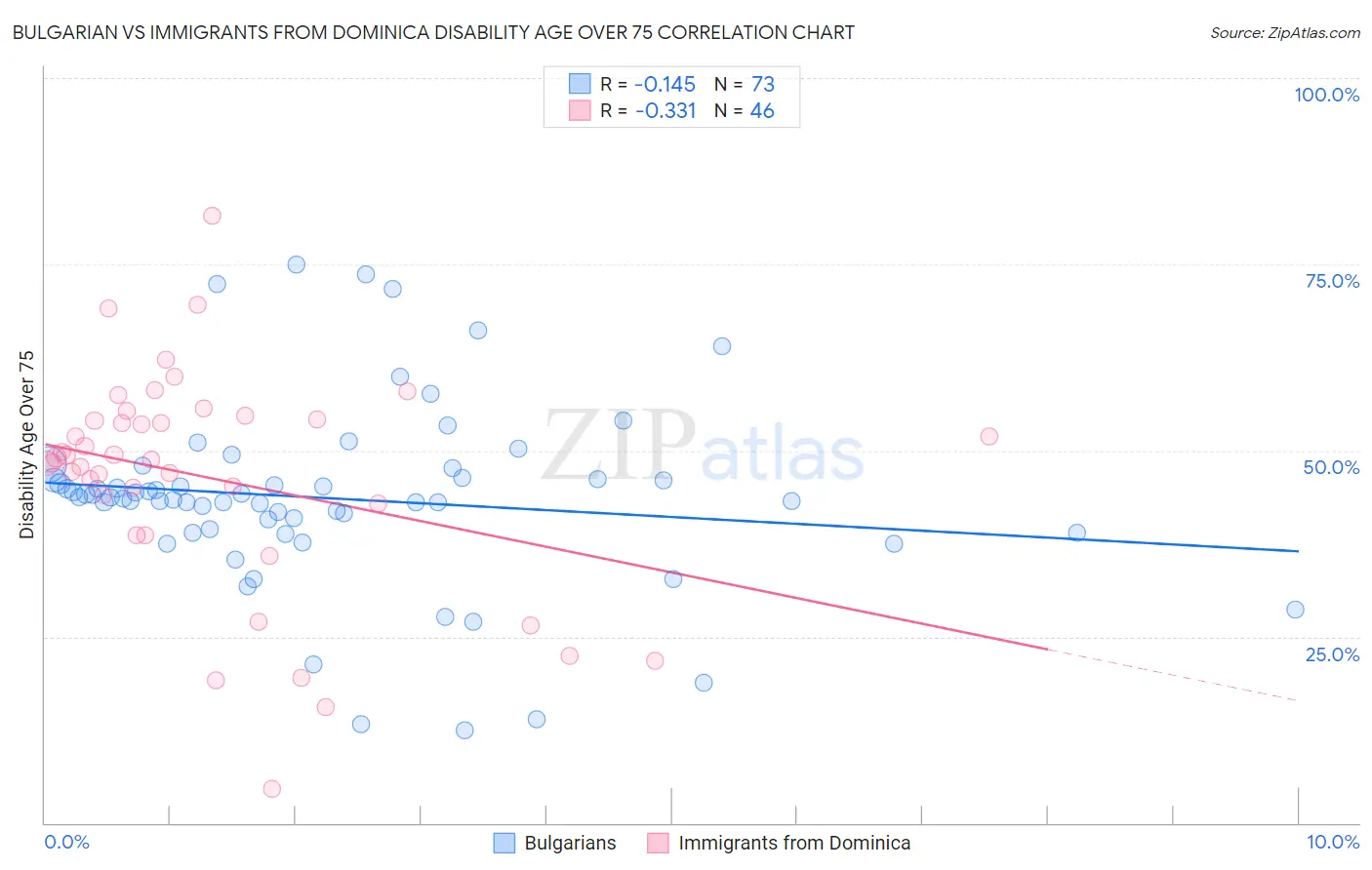 Bulgarian vs Immigrants from Dominica Disability Age Over 75 Correlation Chart