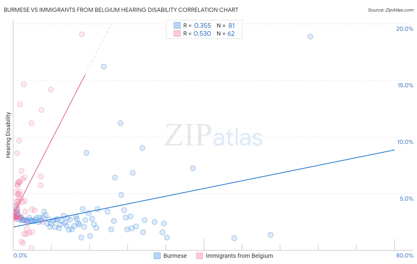 Burmese vs Immigrants from Belgium Hearing Disability Correlation Chart