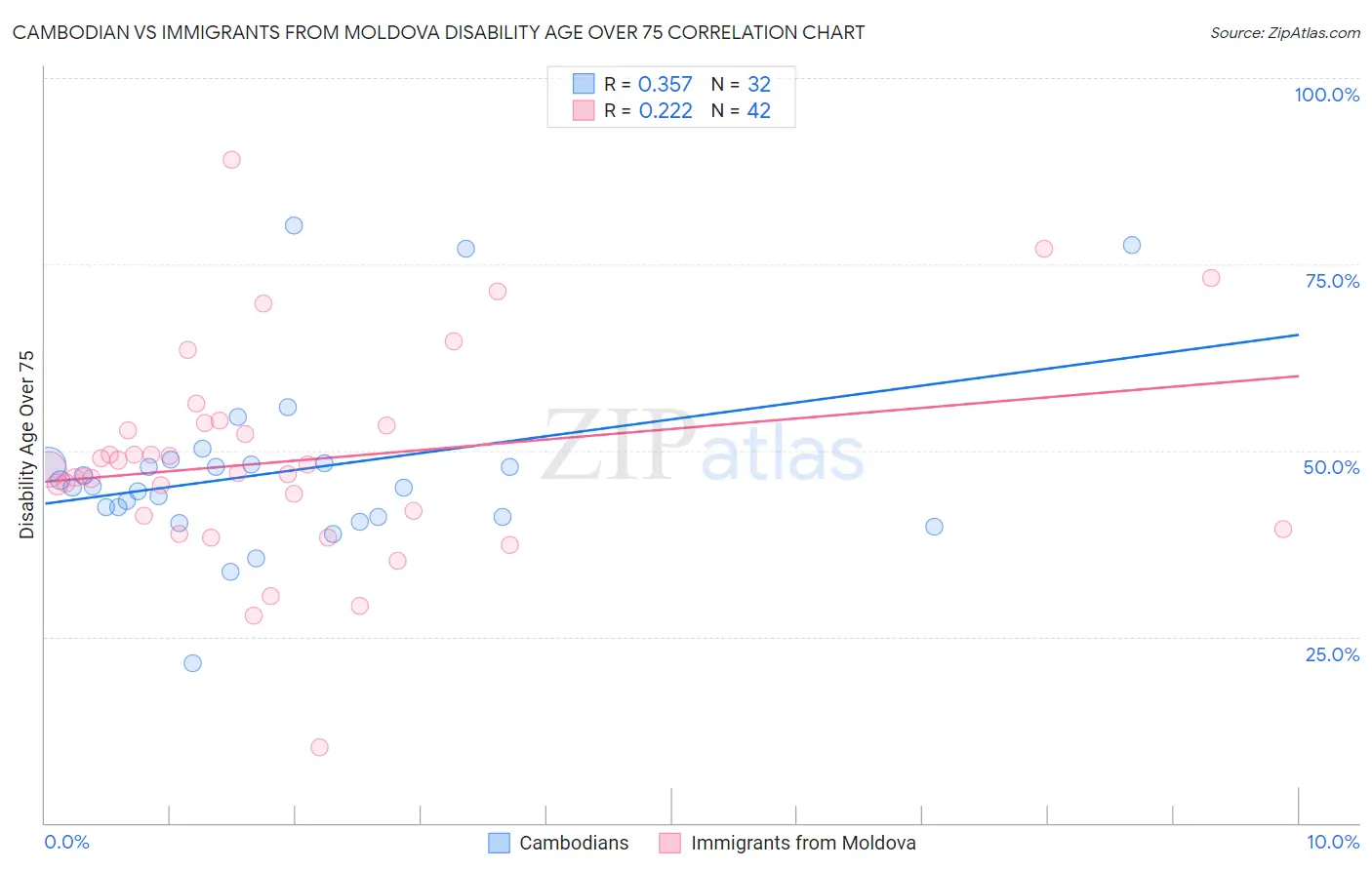 Cambodian vs Immigrants from Moldova Disability Age Over 75 Correlation Chart