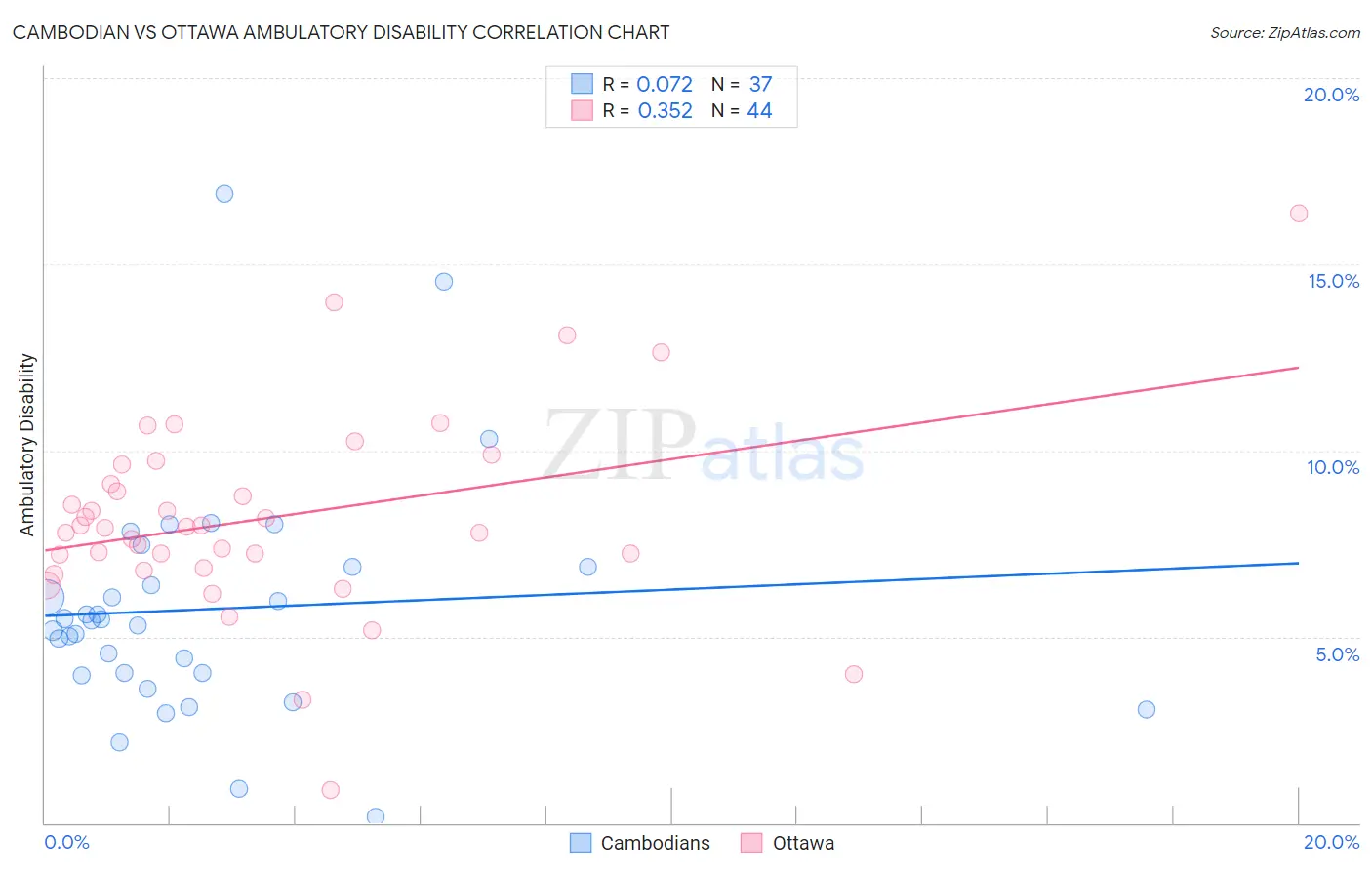 The statistical analysis conducted on geographies consisting of 102,504,705 people shows a slight positive correlation between the proportion of Cambodians and percentage of population with ambulatory disability in the United States with a correlation coefficient (R) of 0.072 and weighted average of 5.4%. Similarly, the statistical analysis conducted on geographies consisting of 49,954,761 people shows a mild positive correlation between the proportion of Ottawa and percentage of population with ambulatory disability in the United States with a correlation coefficient (R) of 0.352 and weighted average of 7.2%, a difference of 32.4%.