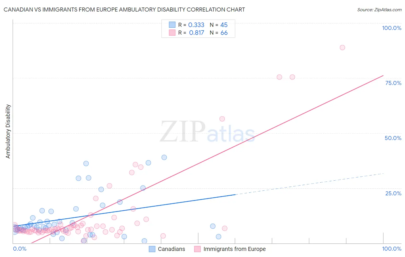 Canadian vs Immigrants from Europe Ambulatory Disability Correlation Chart
