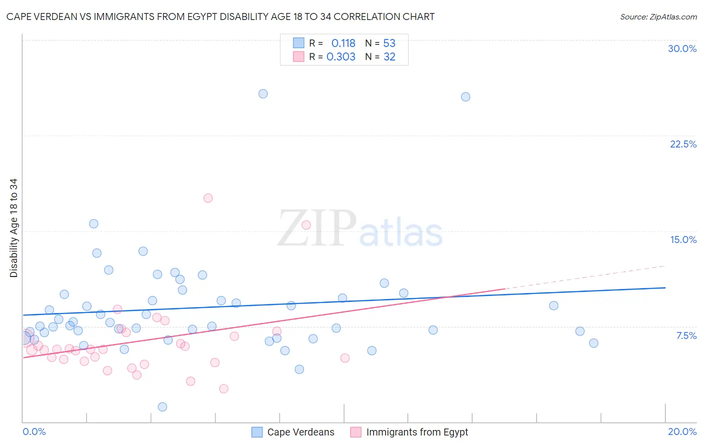Cape Verdean vs Immigrants from Egypt Disability Age 18 to 34 Correlation Chart