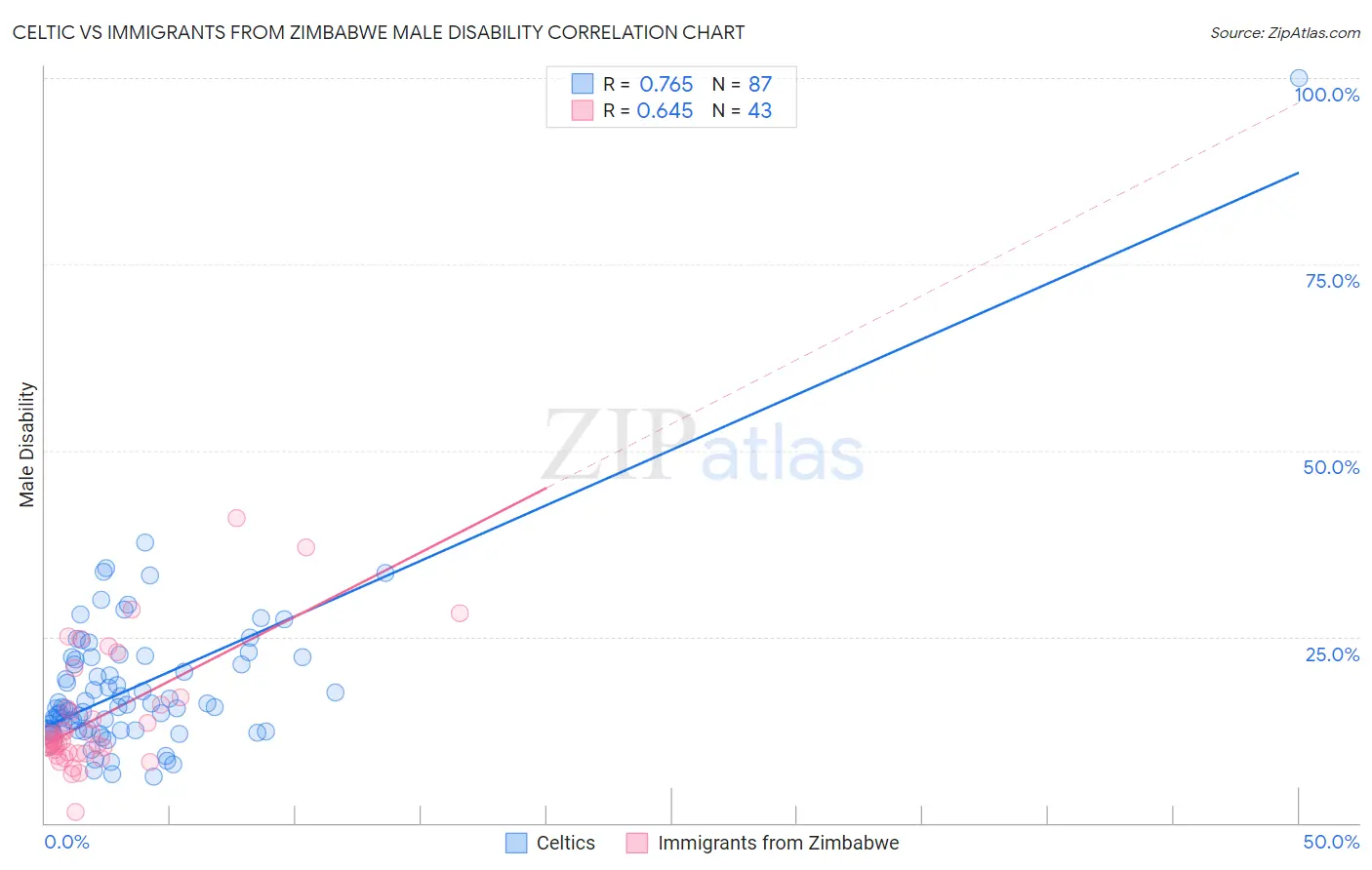 Celtic vs Immigrants from Zimbabwe Male Disability Correlation Chart