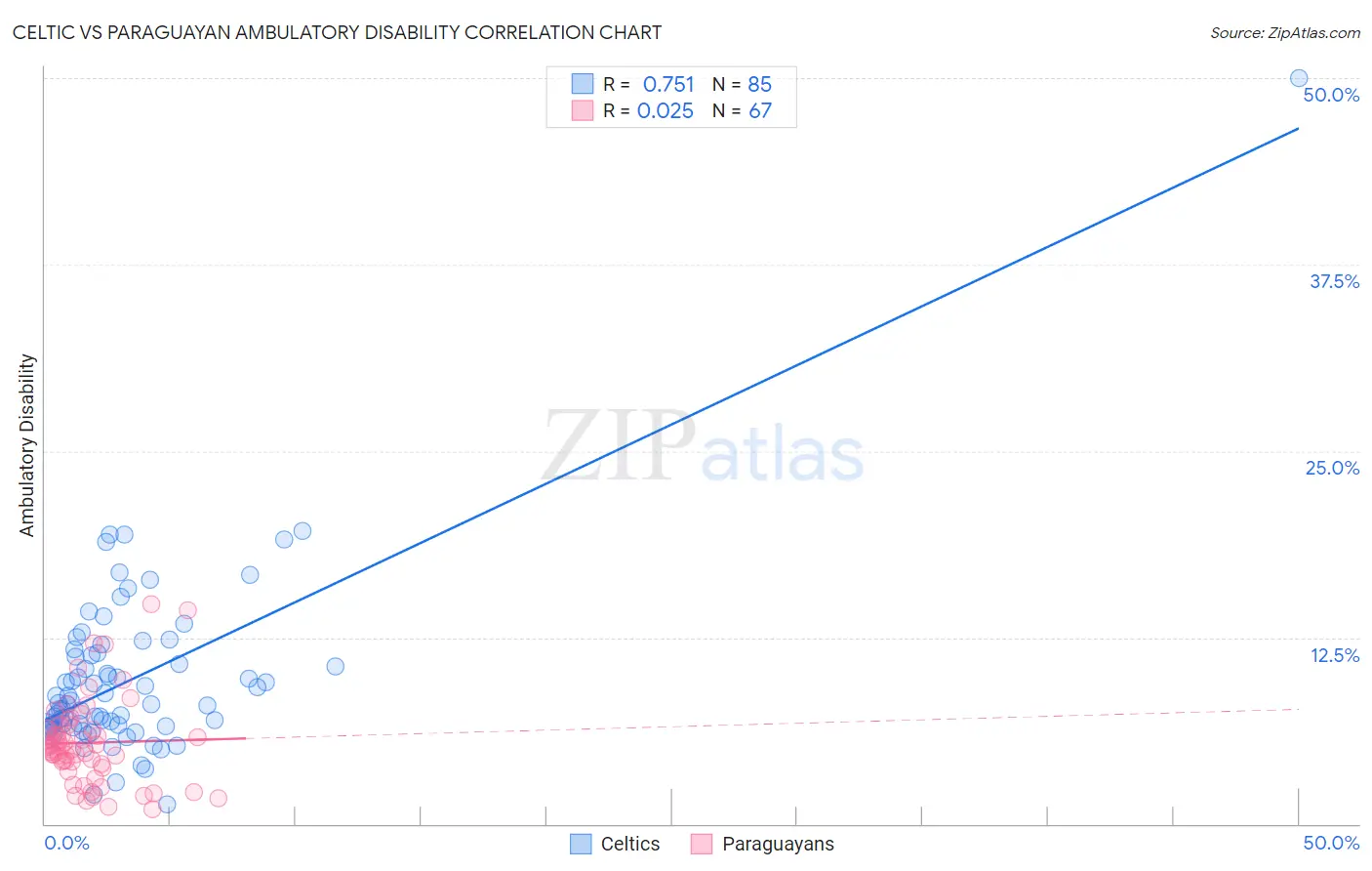 The statistical analysis conducted on geographies consisting of 168,862,473 people shows a strong positive correlation between the proportion of Celtics and percentage of population with ambulatory disability in the United States with a correlation coefficient (R) of 0.751 and weighted average of 6.7%. Similarly, the statistical analysis conducted on geographies consisting of 95,109,897 people shows no correlation between the proportion of Paraguayans and percentage of population with ambulatory disability in the United States with a correlation coefficient (R) of 0.025 and weighted average of 5.5%, a difference of 21.2%.