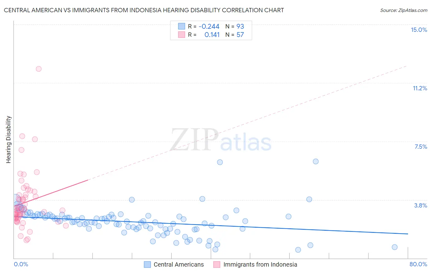 Central American vs Immigrants from Indonesia Hearing Disability Correlation Chart