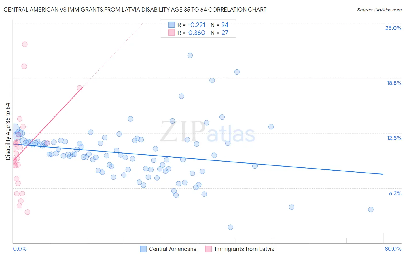 Central American vs Immigrants from Latvia Disability Age 35 to 64 Correlation Chart