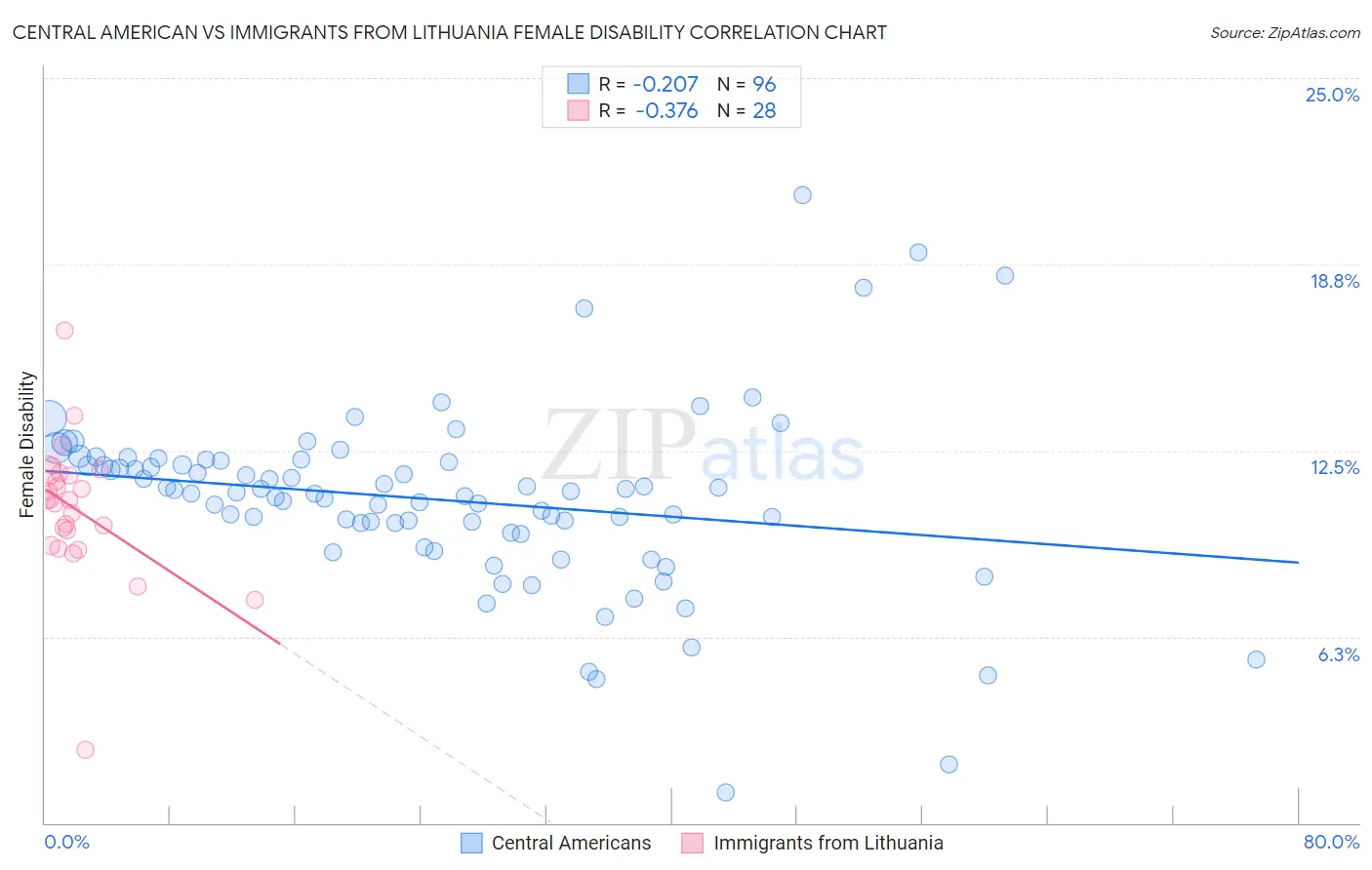 Central American vs Immigrants from Lithuania Female Disability Correlation Chart