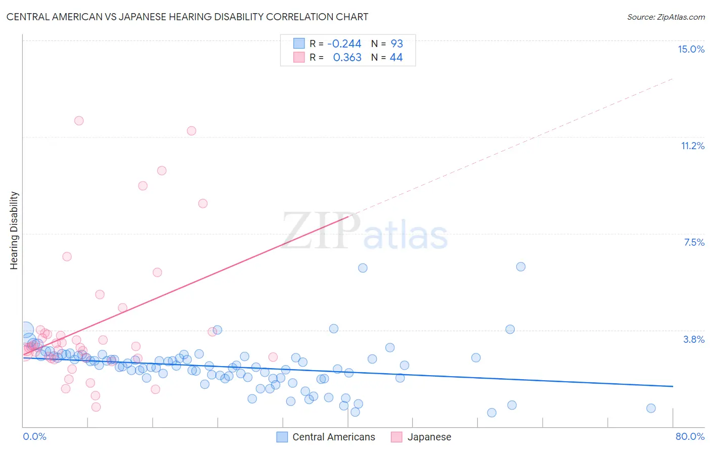 The statistical analysis conducted on geographies consisting of 504,204,845 people shows a weak negative correlation between the proportion of Central Americans and percentage of population with hearing disability in the United States with a correlation coefficient (R) of -0.244 and weighted average of 2.7%. Similarly, the statistical analysis conducted on geographies consisting of 249,105,269 people shows a mild positive correlation between the proportion of Japanese and percentage of population with hearing disability in the United States with a correlation coefficient (R) of 0.363 and weighted average of 3.0%, a difference of 10.1%.