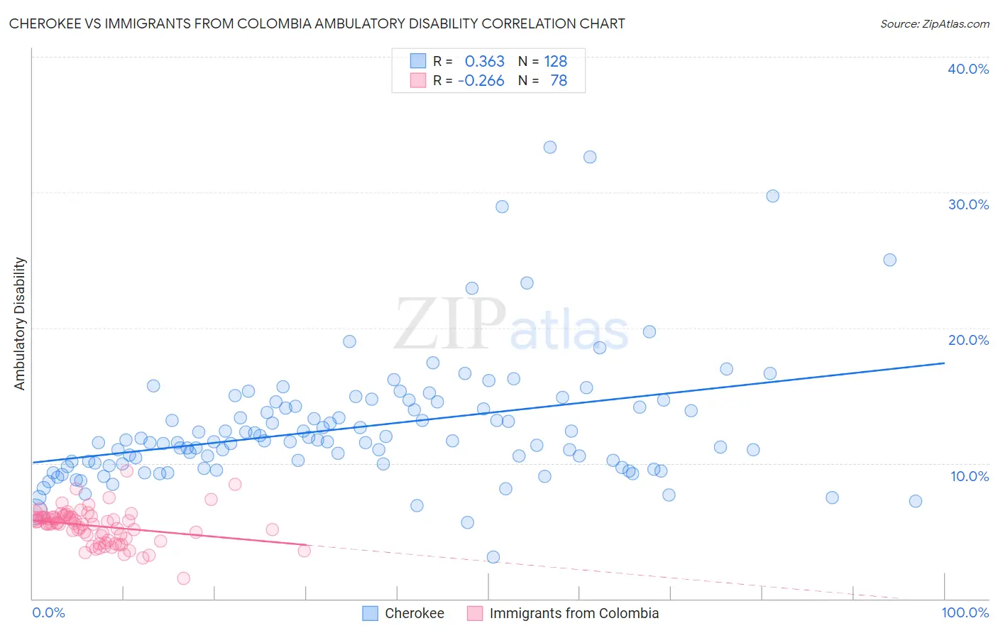 Cherokee vs Immigrants from Colombia Ambulatory Disability Correlation Chart