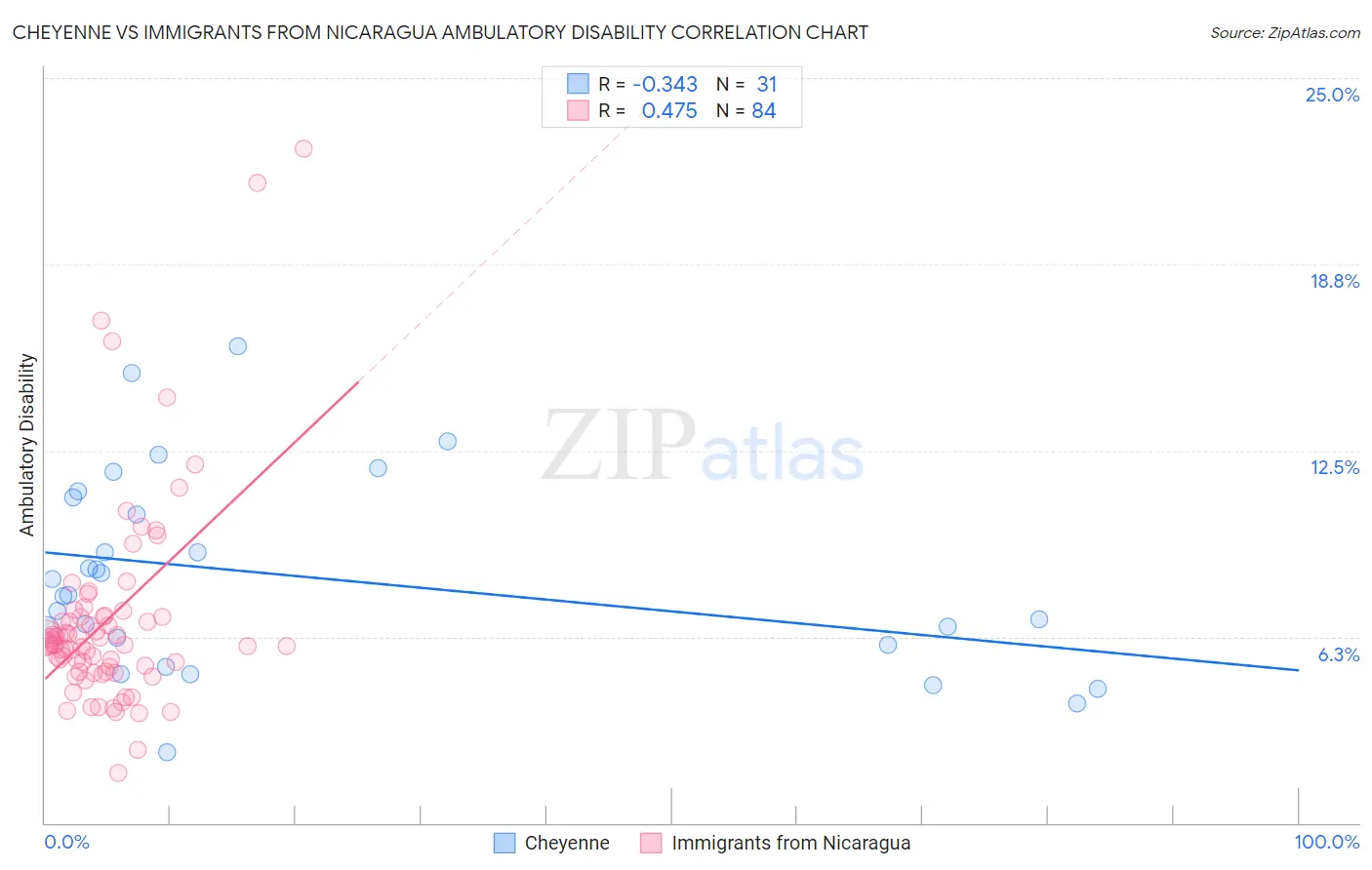 Cheyenne vs Immigrants from Nicaragua Ambulatory Disability Correlation Chart