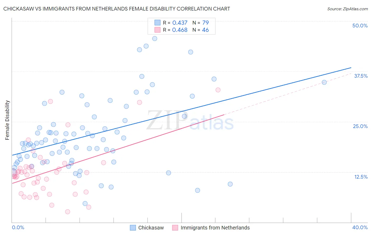 Chickasaw vs Immigrants from Netherlands Female Disability Correlation Chart