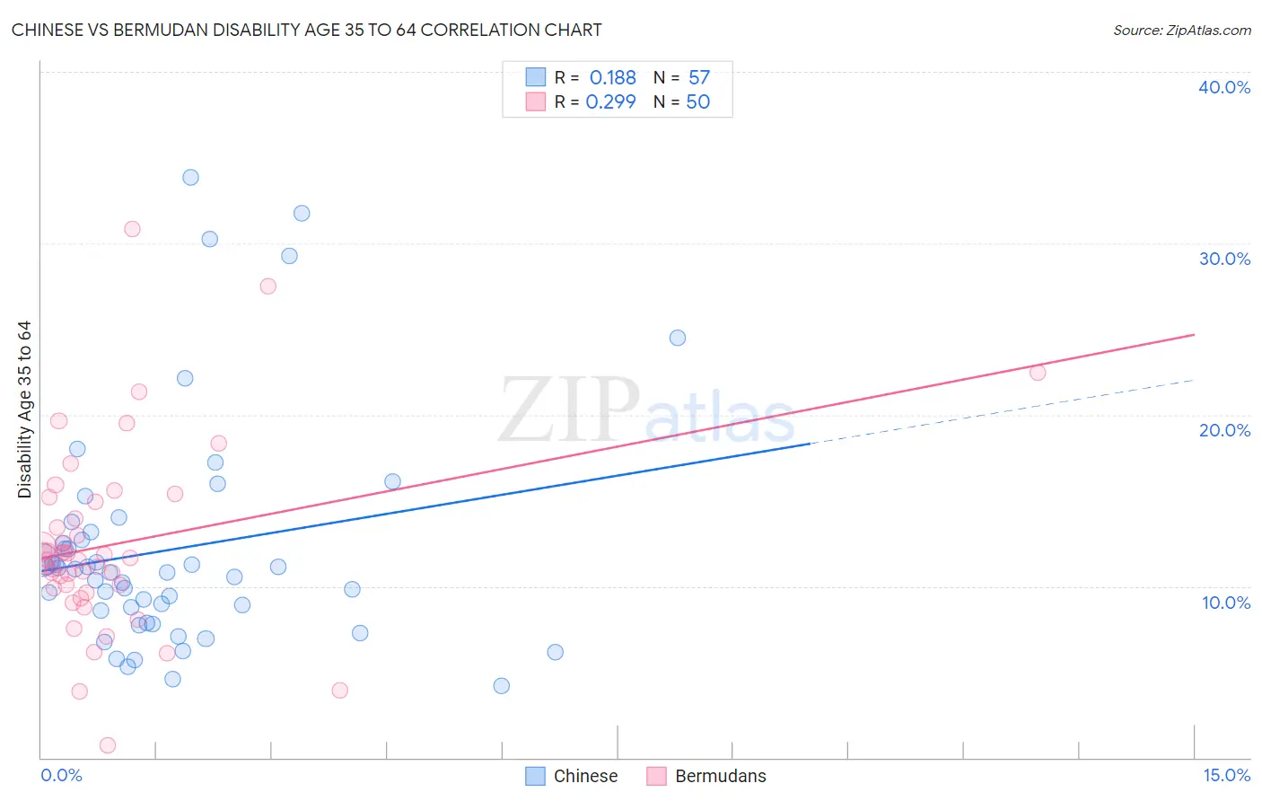 The statistical analysis conducted on geographies consisting of 64,801,742 people shows a poor positive correlation between the proportion of Chinese and percentage of population with a disability between the ages 34 and 64 in the United States with a correlation coefficient (R) of 0.188 and weighted average of 10.3%. Similarly, the statistical analysis conducted on geographies consisting of 55,714,337 people shows a weak positive correlation between the proportion of Bermudans and percentage of population with a disability between the ages 34 and 64 in the United States with a correlation coefficient (R) of 0.299 and weighted average of 11.9%, a difference of 15.9%.