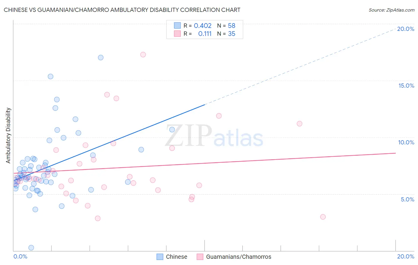 The statistical analysis conducted on geographies consisting of 64,795,509 people shows a moderate positive correlation between the proportion of Chinese and percentage of population with ambulatory disability in the United States with a correlation coefficient (R) of 0.402 and weighted average of 6.5%. Similarly, the statistical analysis conducted on geographies consisting of 221,865,083 people shows a poor positive correlation between the proportion of Guamanians/Chamorros and percentage of population with ambulatory disability in the United States with a correlation coefficient (R) of 0.111 and weighted average of 6.3%, a difference of 3.1%.