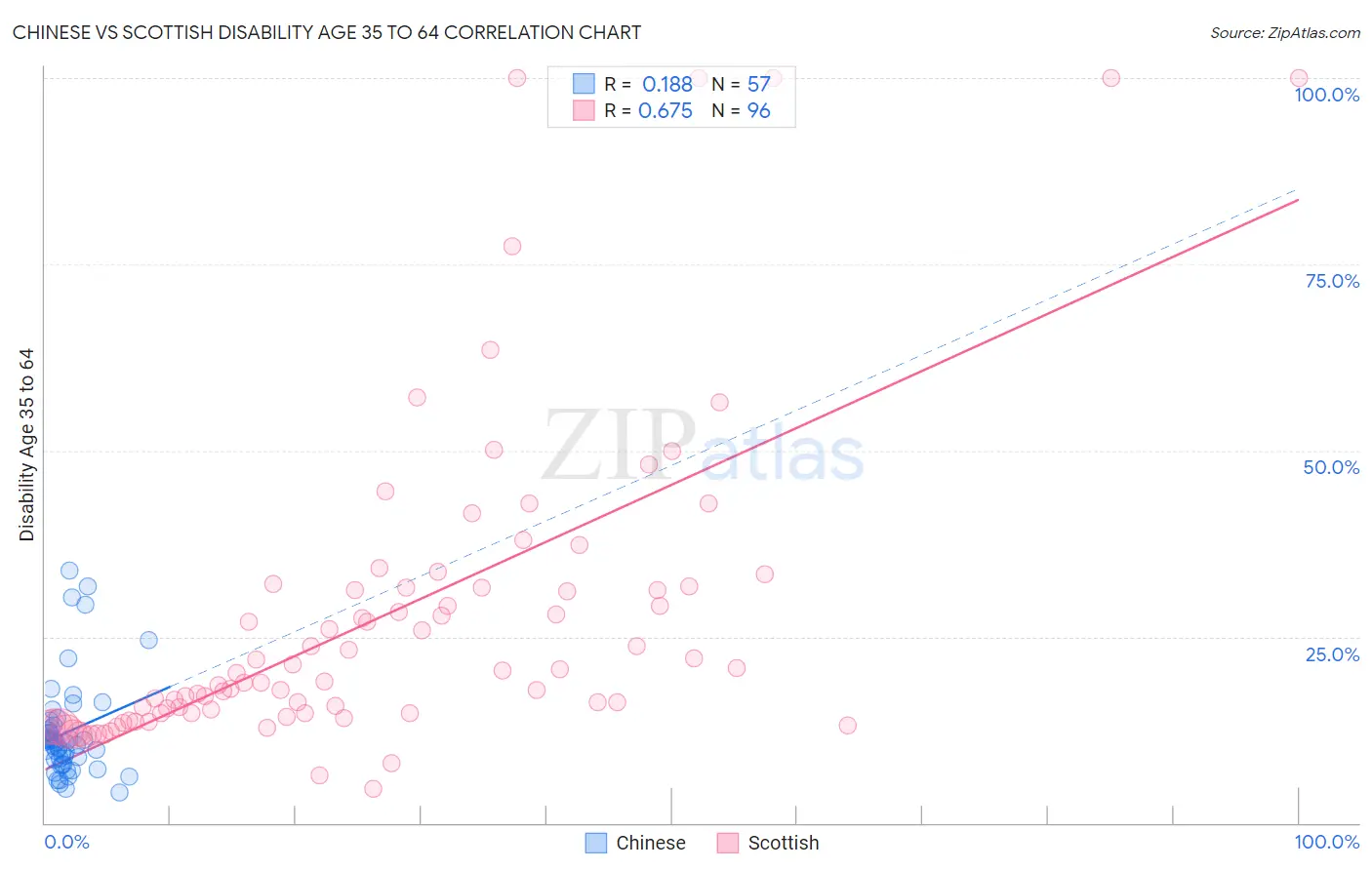 The statistical analysis conducted on geographies consisting of 64,801,742 people shows a poor positive correlation between the proportion of Chinese and percentage of population with a disability between the ages 34 and 64 in the United States with a correlation coefficient (R) of 0.188 and weighted average of 10.3%. Similarly, the statistical analysis conducted on geographies consisting of 566,103,688 people shows a significant positive correlation between the proportion of Scottish and percentage of population with a disability between the ages 34 and 64 in the United States with a correlation coefficient (R) of 0.675 and weighted average of 12.4%, a difference of 20.1%.
