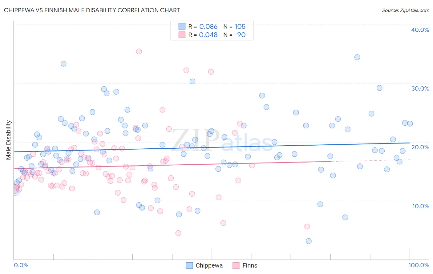 The statistical analysis conducted on geographies consisting of 215,038,110 people shows a slight positive correlation between the proportion of Chippewa and percentage of males with a disability in the United States with a correlation coefficient (R) of 0.086 and weighted average of 14.3%. Similarly, the statistical analysis conducted on geographies consisting of 404,606,067 people shows no correlation between the proportion of Finns and percentage of males with a disability in the United States with a correlation coefficient (R) of 0.048 and weighted average of 12.6%, a difference of 13.3%.