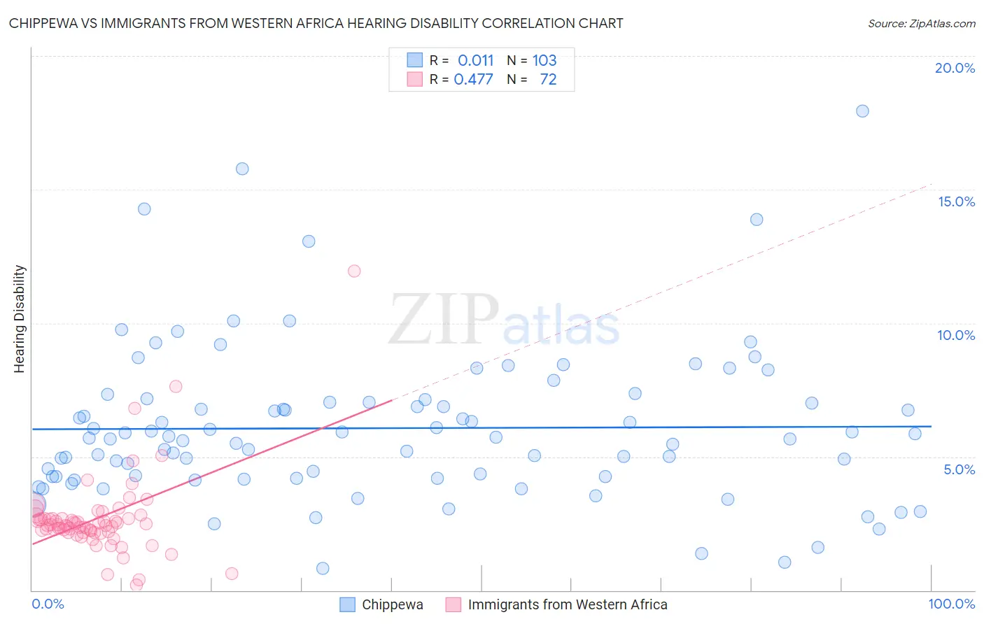 Chippewa vs Immigrants from Western Africa Hearing Disability Correlation Chart