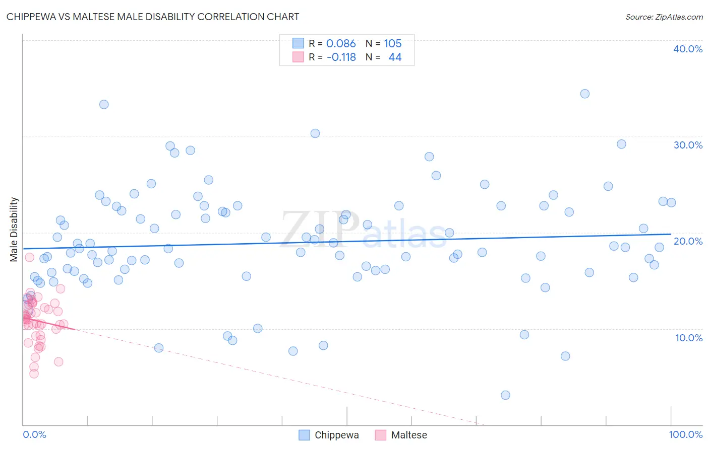 The statistical analysis conducted on geographies consisting of 215,038,110 people shows a slight positive correlation between the proportion of Chippewa and percentage of males with a disability in the United States with a correlation coefficient (R) of 0.086 and weighted average of 14.3%. Similarly, the statistical analysis conducted on geographies consisting of 126,476,999 people shows a poor negative correlation between the proportion of Maltese and percentage of males with a disability in the United States with a correlation coefficient (R) of -0.118 and weighted average of 11.2%, a difference of 27.3%.