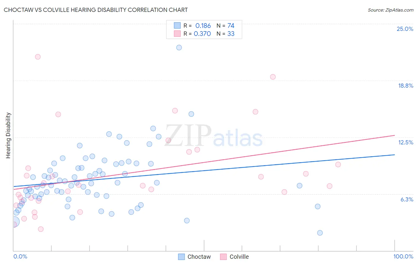 The statistical analysis conducted on geographies consisting of 269,646,224 people shows a poor positive correlation between the proportion of Choctaw and percentage of population with hearing disability in the United States with a correlation coefficient (R) of 0.186 and weighted average of 4.5%. Similarly, the statistical analysis conducted on geographies consisting of 34,687,289 people shows a mild positive correlation between the proportion of Colville and percentage of population with hearing disability in the United States with a correlation coefficient (R) of 0.370 and weighted average of 5.3%, a difference of 17.5%.