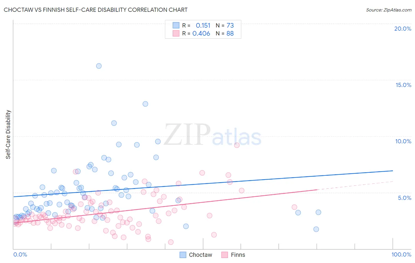 Choctaw vs Finnish Self-Care Disability Correlation Chart