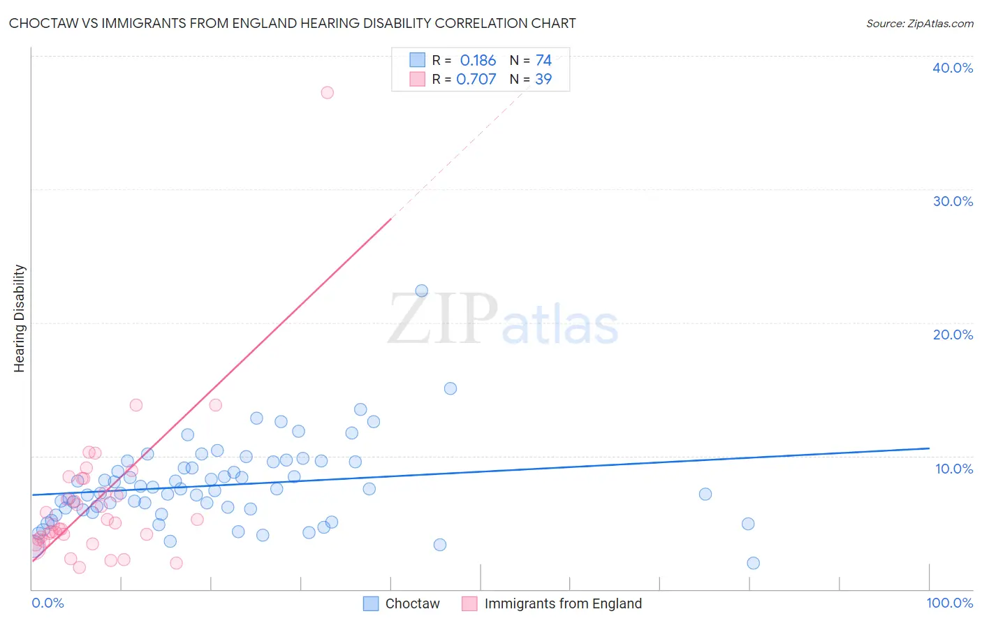 Choctaw vs Immigrants from England Hearing Disability Correlation Chart