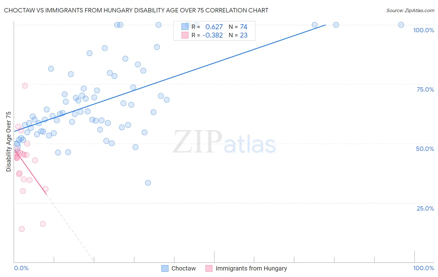 Choctaw vs Immigrants from Hungary Disability Age Over 75 Correlation Chart