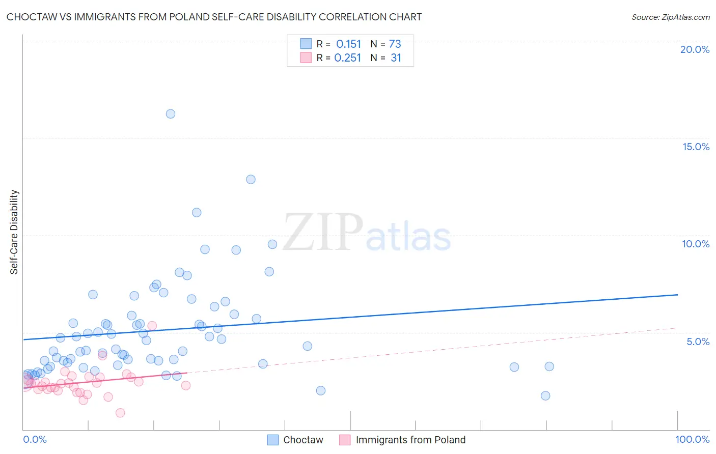 Choctaw vs Immigrants from Poland Self-Care Disability Correlation Chart