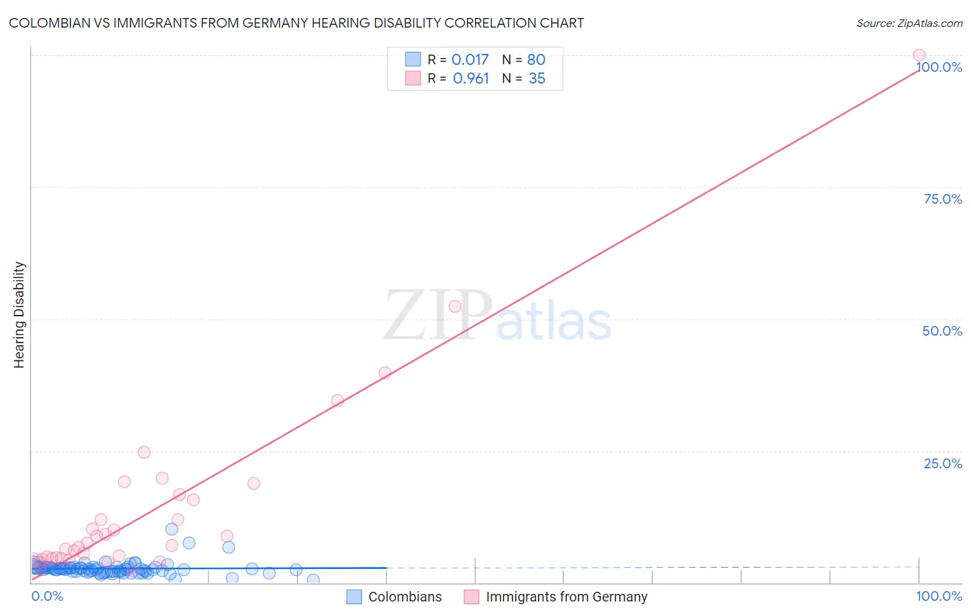 Colombian vs Immigrants from Germany Hearing Disability Correlation Chart