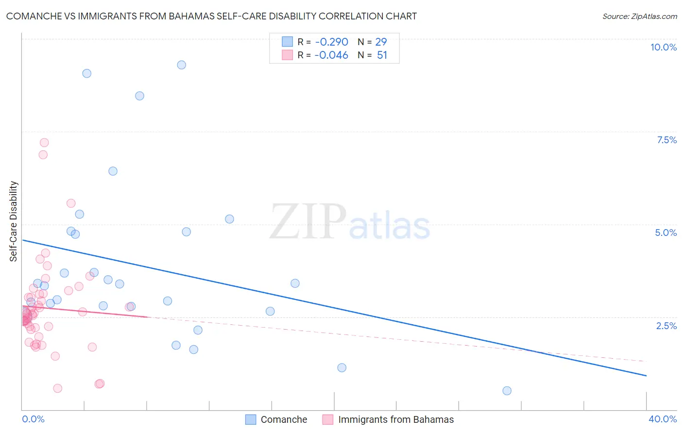Comanche vs Immigrants from Bahamas Self-Care Disability Correlation Chart