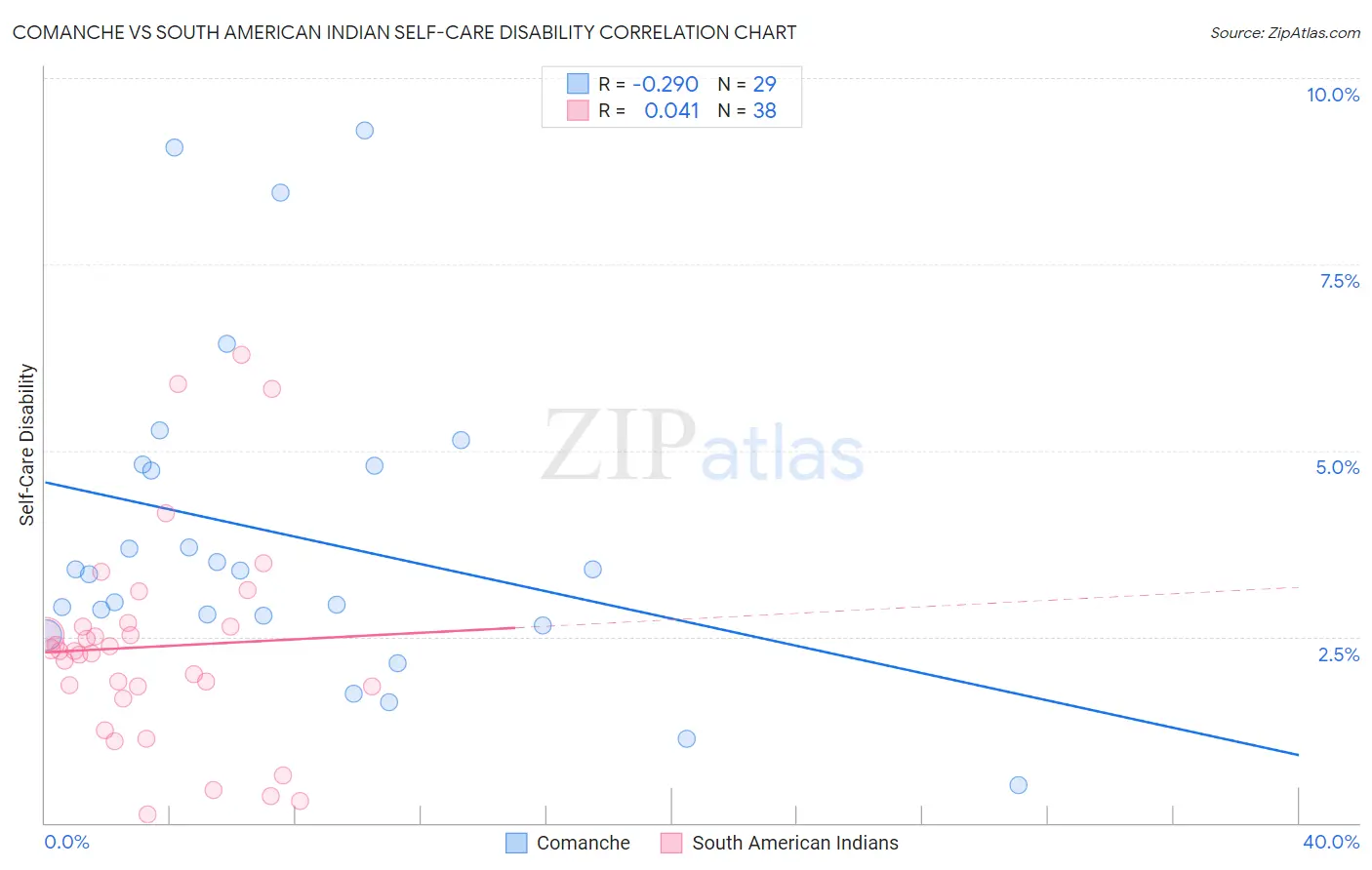 The statistical analysis conducted on geographies consisting of 109,703,809 people shows a weak negative correlation between the proportion of Comanche and percentage of population with self-care disability in the United States with a correlation coefficient (R) of -0.290 and weighted average of 2.9%. Similarly, the statistical analysis conducted on geographies consisting of 164,517,360 people shows no correlation between the proportion of South American Indians and percentage of population with self-care disability in the United States with a correlation coefficient (R) of 0.041 and weighted average of 2.4%, a difference of 19.2%.