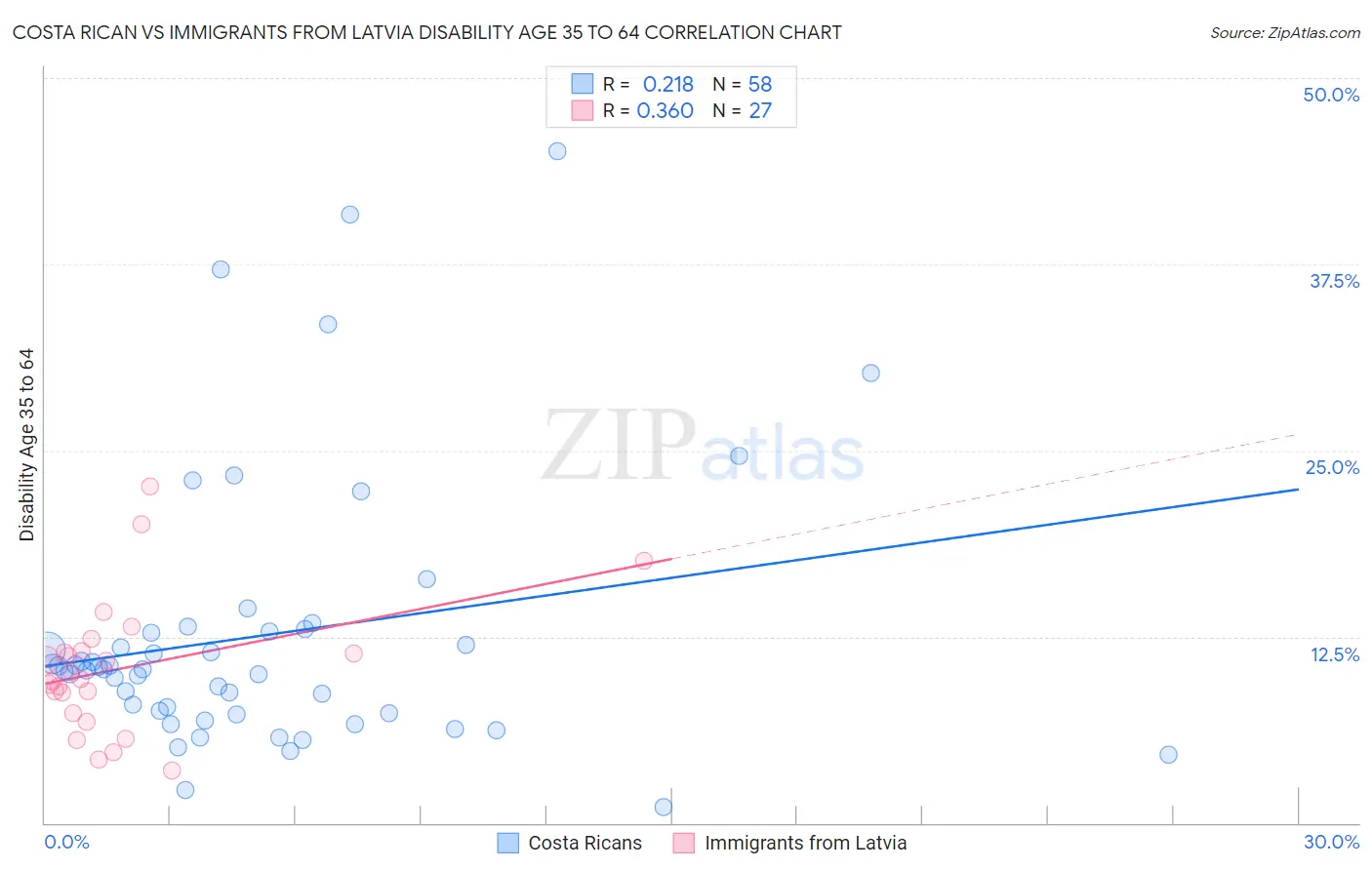 Costa Rican vs Immigrants from Latvia Disability Age 35 to 64 Correlation Chart