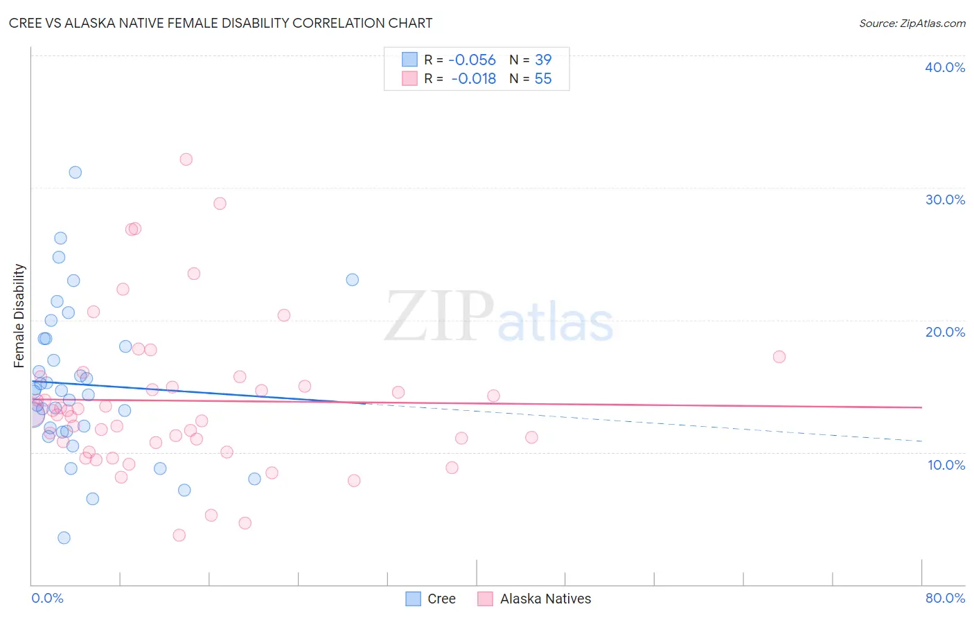 The statistical analysis conducted on geographies consisting of 76,204,869 people shows a slight negative correlation between the proportion of Cree and percentage of females with a disability in the United States with a correlation coefficient (R) of -0.056 and weighted average of 13.7%. Similarly, the statistical analysis conducted on geographies consisting of 76,769,198 people shows no correlation between the proportion of Alaska Natives and percentage of females with a disability in the United States with a correlation coefficient (R) of -0.018 and weighted average of 12.8%, a difference of 7.1%.