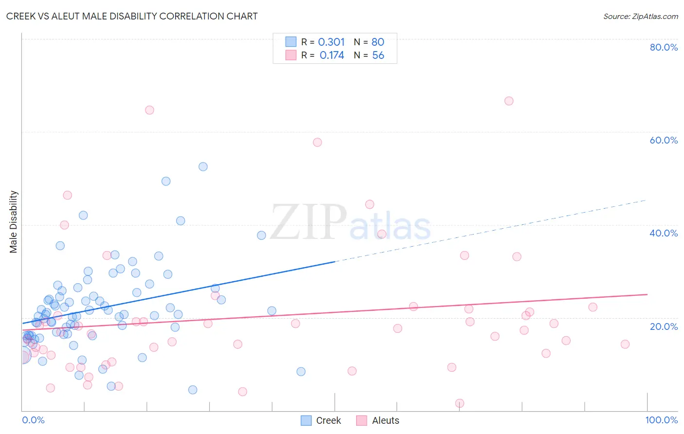 The statistical analysis conducted on geographies consisting of 178,460,797 people shows a mild positive correlation between the proportion of Creek and percentage of males with a disability in the United States with a correlation coefficient (R) of 0.301 and weighted average of 15.5%. Similarly, the statistical analysis conducted on geographies consisting of 61,781,490 people shows a poor positive correlation between the proportion of Aleuts and percentage of males with a disability in the United States with a correlation coefficient (R) of 0.174 and weighted average of 13.5%, a difference of 14.6%.