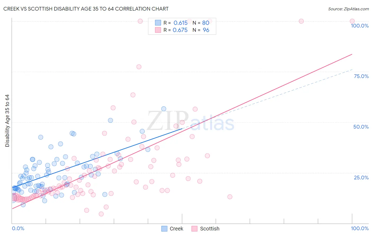 The statistical analysis conducted on geographies consisting of 178,427,541 people shows a significant positive correlation between the proportion of Creek and percentage of population with a disability between the ages 34 and 64 in the United States with a correlation coefficient (R) of 0.615 and weighted average of 16.9%. Similarly, the statistical analysis conducted on geographies consisting of 566,103,688 people shows a significant positive correlation between the proportion of Scottish and percentage of population with a disability between the ages 34 and 64 in the United States with a correlation coefficient (R) of 0.675 and weighted average of 12.4%, a difference of 36.5%.
