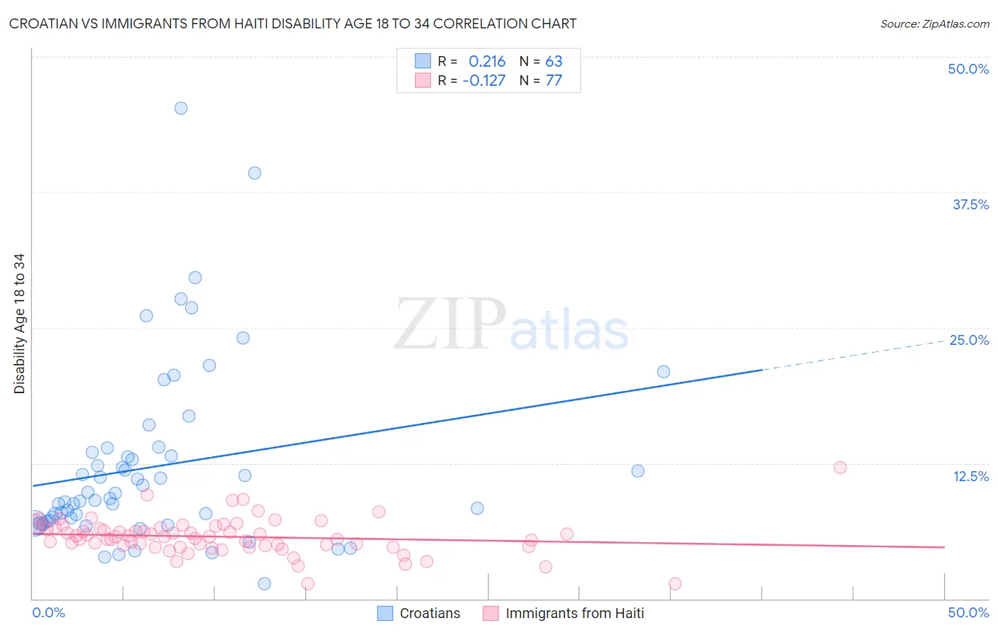 Croatian vs Immigrants from Haiti Disability Age 18 to 34 Correlation Chart