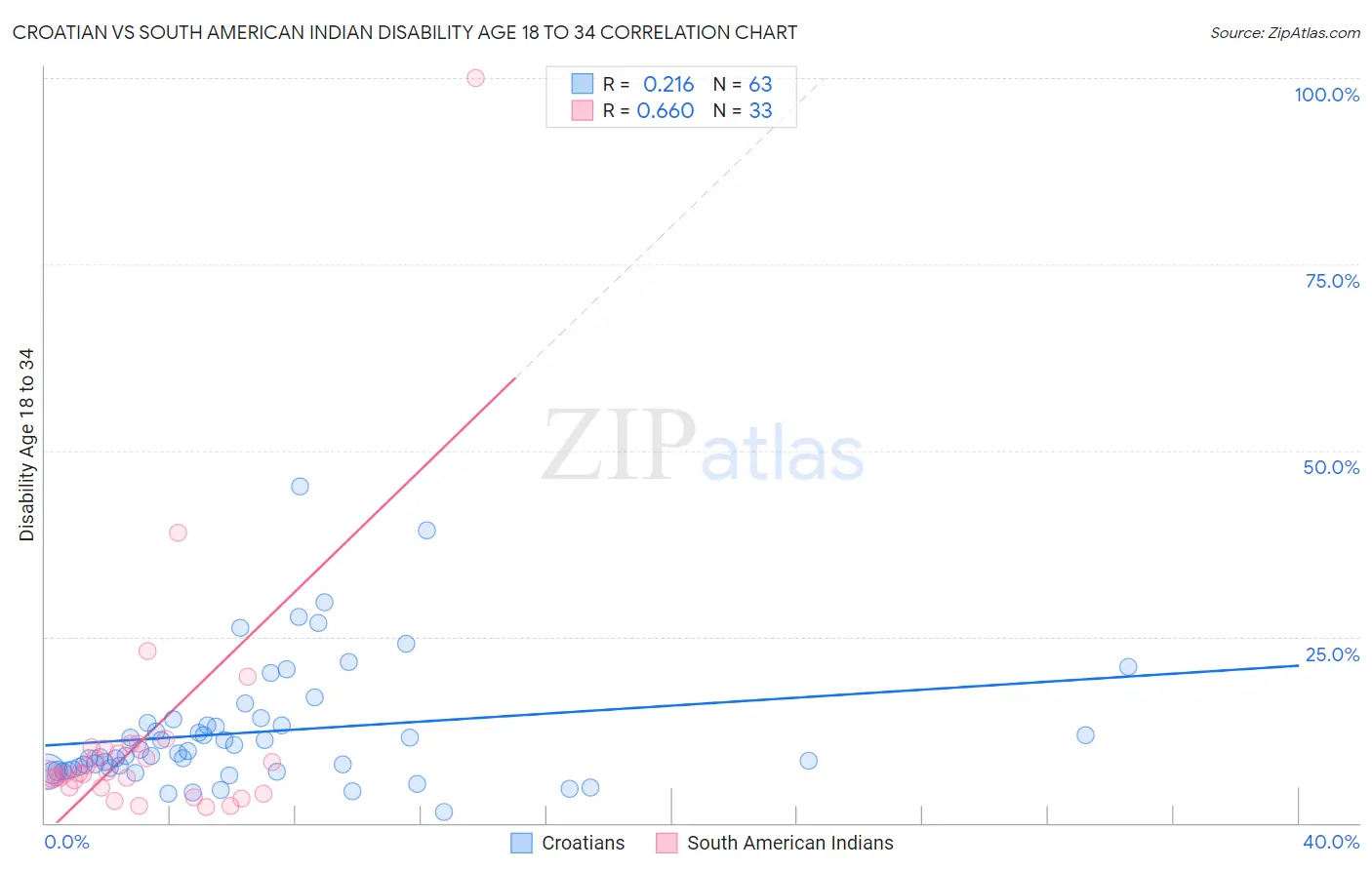 Croatian vs South American Indian Disability Age 18 to 34 Correlation Chart