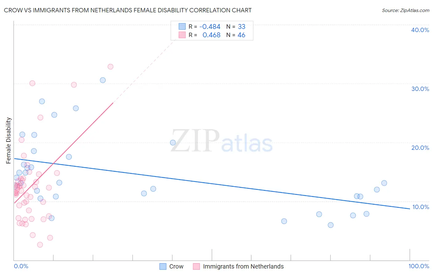 Crow vs Immigrants from Netherlands Female Disability Correlation Chart