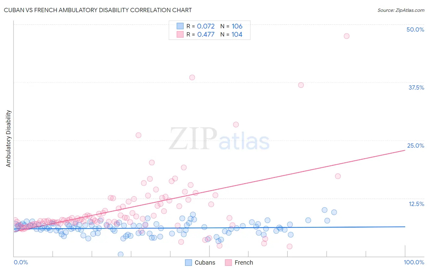 The statistical analysis conducted on geographies consisting of 449,114,501 people shows a slight positive correlation between the proportion of Cubans and percentage of population with ambulatory disability in the United States with a correlation coefficient (R) of 0.072 and weighted average of 6.4%. Similarly, the statistical analysis conducted on geographies consisting of 571,874,701 people shows a moderate positive correlation between the proportion of French and percentage of population with ambulatory disability in the United States with a correlation coefficient (R) of 0.477 and weighted average of 6.6%, a difference of 4.3%.