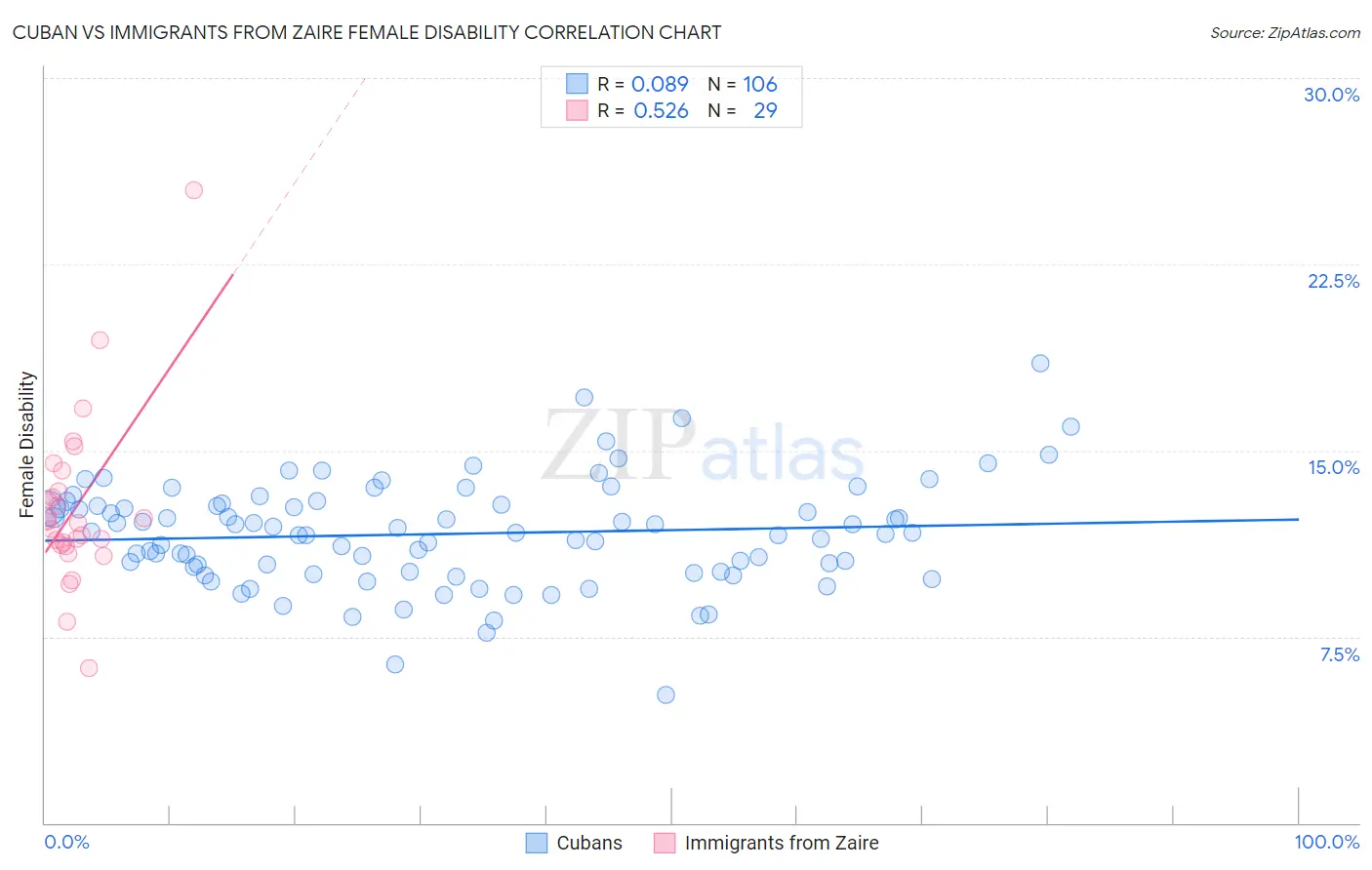 Cuban vs Immigrants from Zaire Female Disability Correlation Chart